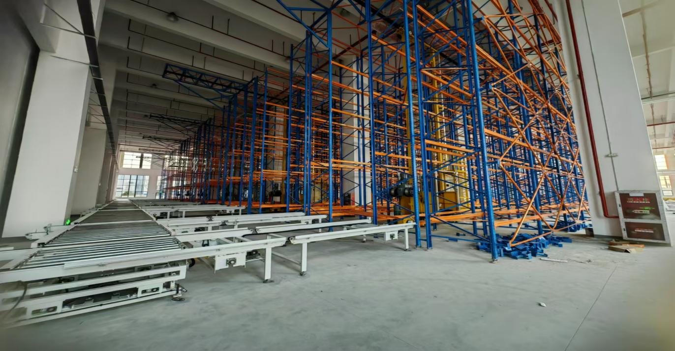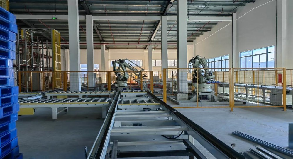 实现生产全流程的物流自动化 , 即应用自动机械手、 AGV、 RGV、 输送机、 包装系统、 机器人 , 立库等实现产品的自动上下线、 转运、 缠膜、 捆扎码垛、 贴标等。 并实现信息追溯 , 节省了80%的人工成本 ,提高了800%的存储率。